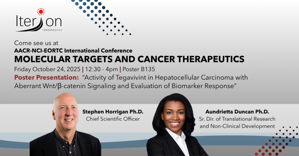Iterion is excited to present new data on Tegavivint at the upcoming AACR–NCI–EORTC International Conference on Molecular Targets and Cancer Therapeutics, October 22–25 in Boston.